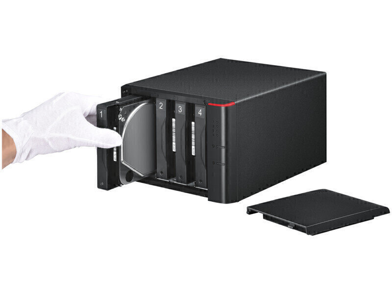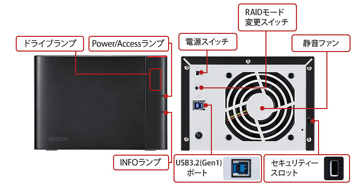 安全性(耐障害性)・高速性・保存可能容量のバランスがよいRAID 5、高速性と保存可能容量は大きいが安全性が低いストライピング(RAID 0)、安全性は高い保存容量の少ないRAID 1、安全性と高速性は高いが保存可能容量が少ないRAID 10の4つのRAIDモードを搭載しています。保存するデータの種類や重視するポイントなどお客様の用途によってモードをお選びいただけます。