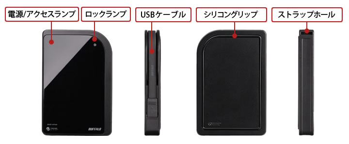 | 主な付属品 | USBケーブルA to miniB、USB延長ケーブル(50cm)、取扱説明書 ※ユーティリティーは本体に内蔵(ドライブナビゲーター、パスワード認証ソフトウェア、TrendMicro USB Security 2.0、ecoマネージャー、AdobeReader、PDFマニュアル) ※保証書(パッケージに記載) |
