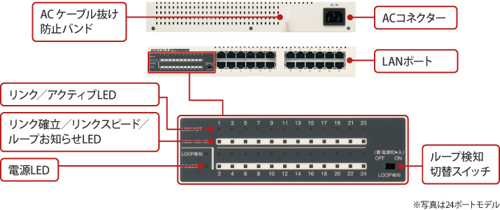 ループ発生時には、ループ発生したことをお知らせするために、ループ検知のLEDが「赤色」に点滅します。また、どのポートでループが発生したかが分かるよう、発生したポートのLEDが点滅。迅速なループ排除が可能です。