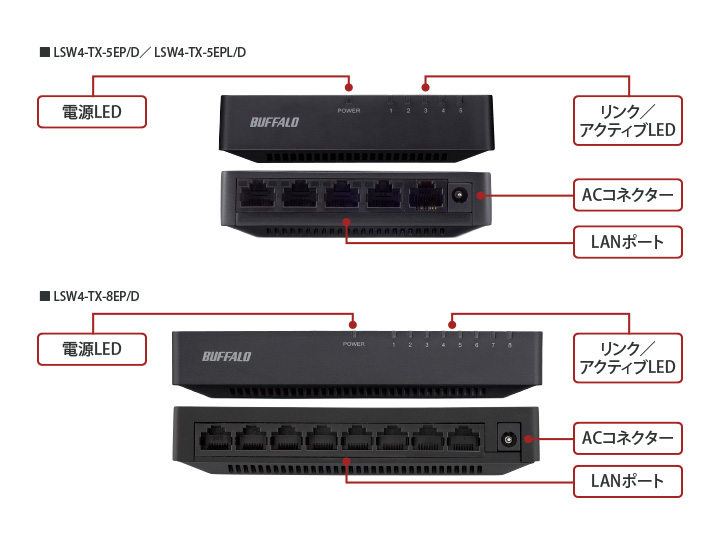 | ポート数 | LSW4-TX-8EP/D:8ポート LSW4-TX-5EP/D:5ポート |