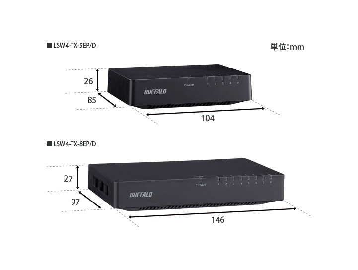 | 外形寸法(幅×高さ×奥行) | LSW4-TX-8EP/D:146×27×97mm LSW4-TX-5EP/D:104×26×85mm ※本体のみ(突起部除く) |