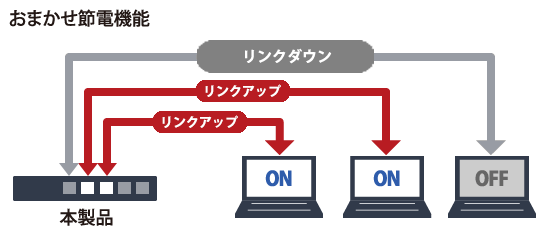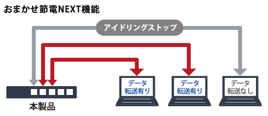 データの流れていないときの消費電力をカットする「おまかせ節電NEXT」機能を搭載。本商品に接続されたパソコンなどの電源がON状態でも、通信を行わない期間はアイドリング信号を止めることで大幅に消費電力を抑えます。通常使用時においても大幅な節電を実現します。