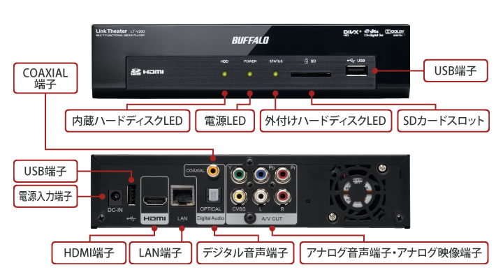 本商品は、高画質なDivX HDビデオ形式の再生に対応した、DivX HD認証を取得したメディアプレーヤーです。DivX HDビデオは、高画質なハイビジョン映像を高画質なまま圧縮することができ、従来のHDコンテンツとは異なり、様々なコンピューター上で楽しめるだけでなく、本商品のようなメディアプレーヤー、ブルーレイプレーヤー、デジタルテレビなどのDivX HD認証機器でも楽しめます。コンピューター上にあるHDビデオを持ち出して、リビングルームの大画面テレビで視聴することができます。DivX HDビデオはDRM(著作権保護)にも対応しており、DivX HD形式で配信されている映画などのプレミアムコンテンツを、本商品で再生することができます。DivXに関する情報は、www.divx.com をご覧ください。