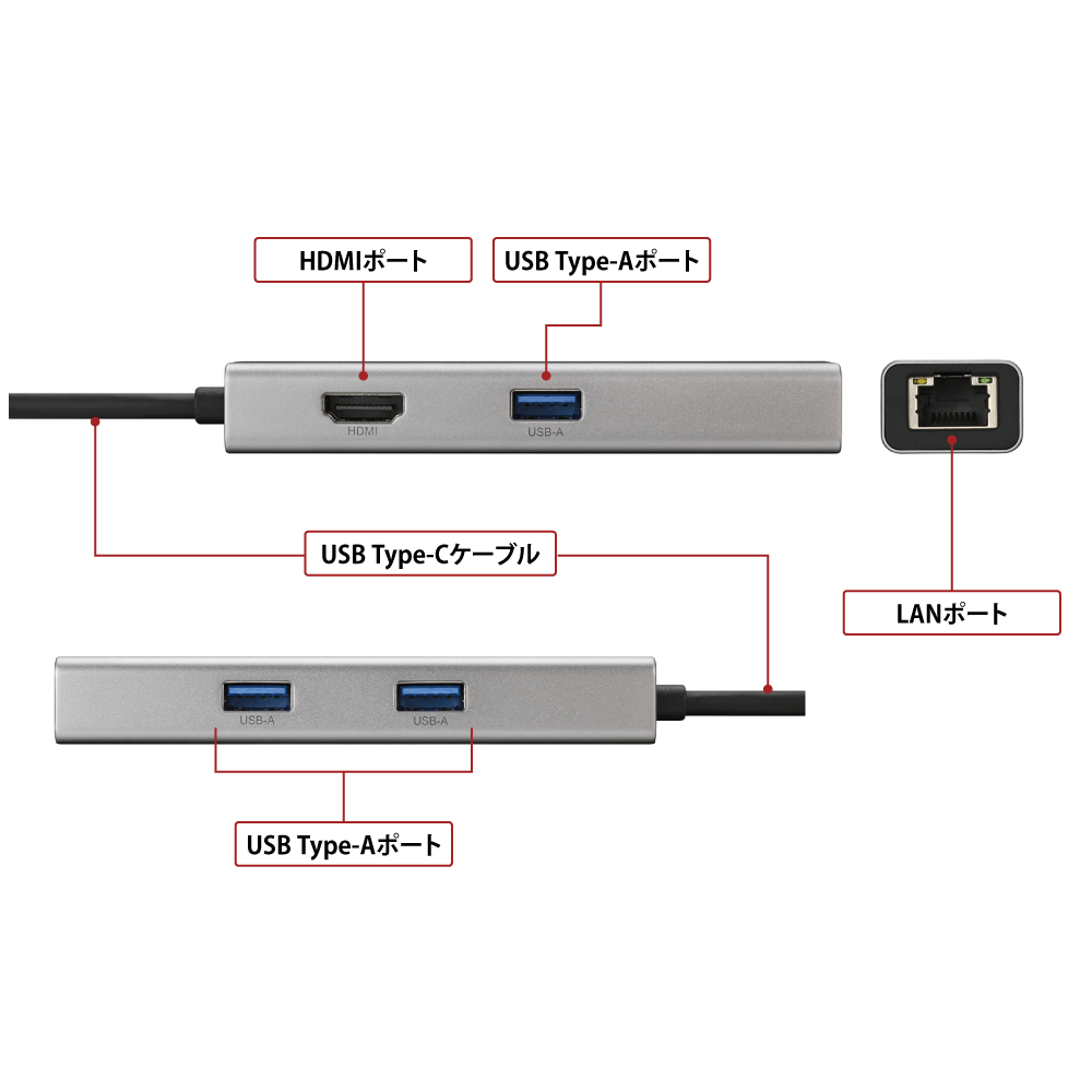 | USBポート | パソコン側 | ・Type-C オス×1(ケーブル直付け):通信用、 USB 3.2(Gen 1)/3.1(Gen 1)/3.0/2.0/1.1 |