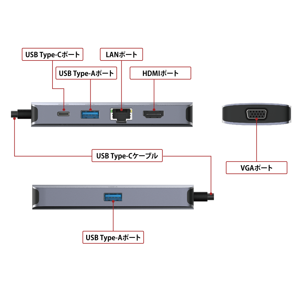 | 周辺機器側 | ・USB Type-Cメス×1:通信用、USB 3.2(Gen 1)/3.1(Gen 1) /3.0/2.0/1.1 、通信時最大電流900mA ・USB Type-Aメス×2:通信用、USB 3.2(Gen 1)/3.1(Gen 1) /3.0/2.0/1.1、 最大電流 各900mA ※本商品のUSB Type-CポートからのAlternate Modeによる映像出力には対応しておりません。 |
