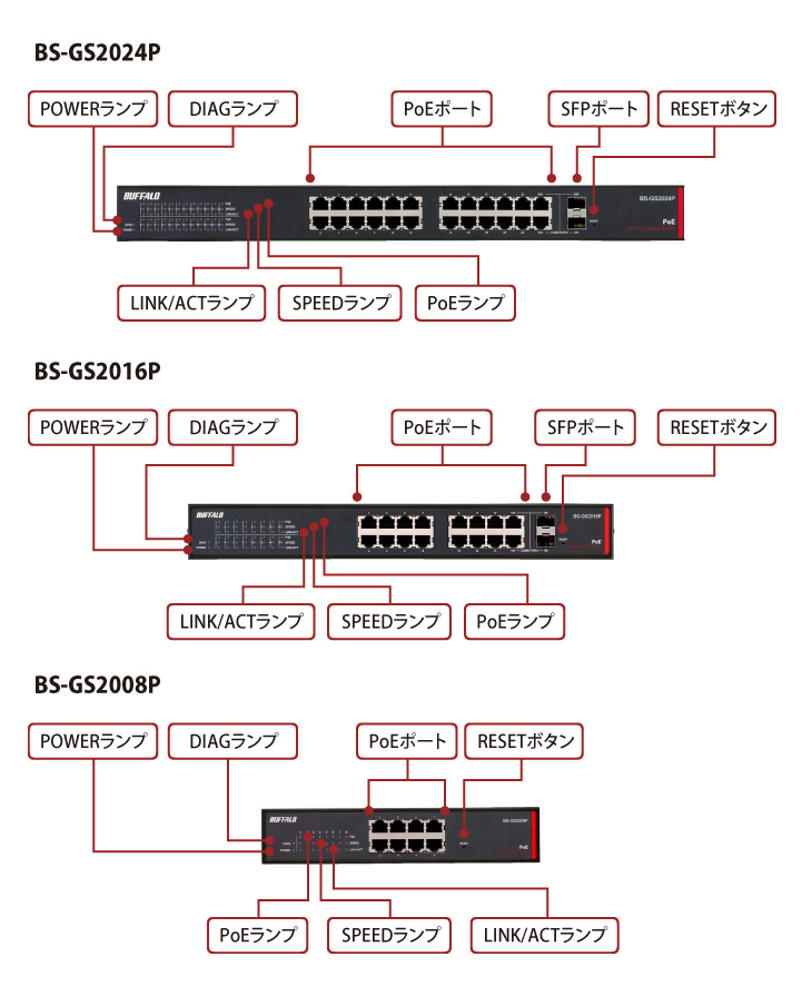 | ポート数 | BS-GS2024P:10/100/1000M 24ポート(全ポートAuto-MDIX機能搭載)+SFP2ポート(コンボポート) BS-GS2016P:10/100/1000M 16ポート(全ポートAuto-MDIX機能搭載)+SFP2ポート(コンボポート) BS-GS2008P:10/100/1000M 8ポート(全ポートAuto-MDIX機能搭載) |