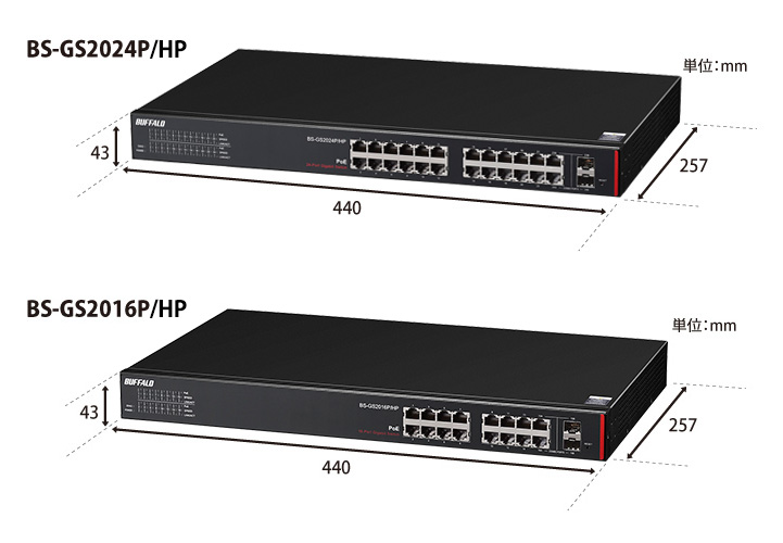 | 外形寸法(幅×高さ×奥行) | BS-GS2024P/HP:440×43×257mm BS-GS2016P/HP:440×43×257mm |