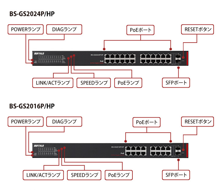 | ポート数 | BS-GS2024P/HP:10/100/1000M 24ポート(全ポートAuto-MDIX機能搭載)+SFP2ポート(コンボポート) BS-GS2016P/HP:10/100/1000M 16ポート(全ポートAuto-MDIX機能搭載)+SFP2ポート(コンボポート) |