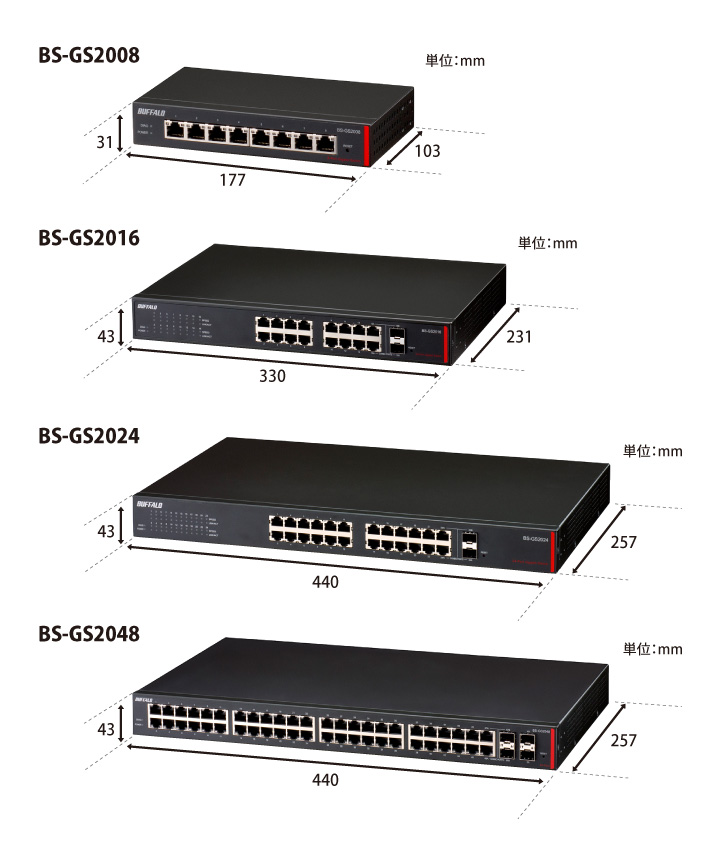 | 外形寸法(幅×高さ×奥行) | BS-GS2048:440×43×257mm BS-GS2024:440×43×257mm BS-GS2016:330×43×231mm BS-GS2008:177×31×103mm |