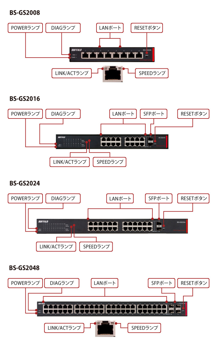 | ポート数 | BS-GS2048:10/100/1000M 48ポート(全ポートAuto-MDIX機能搭載)+SFP4ポート(2ポートはコンボ) BS-GS2024:10/100/1000M 24ポート(全ポートAuto-MDIX機能搭載)+SFP2ポート(コンボポート) BS-GS2016:10/100/1000M 16ポート(全ポートAuto-MDIX機能搭載)+SFP2ポート(コンボポート) BS-GS2008:10/100/1000M 8ポート(全ポートAuto-MDIX機能搭載) |