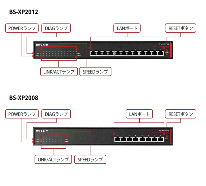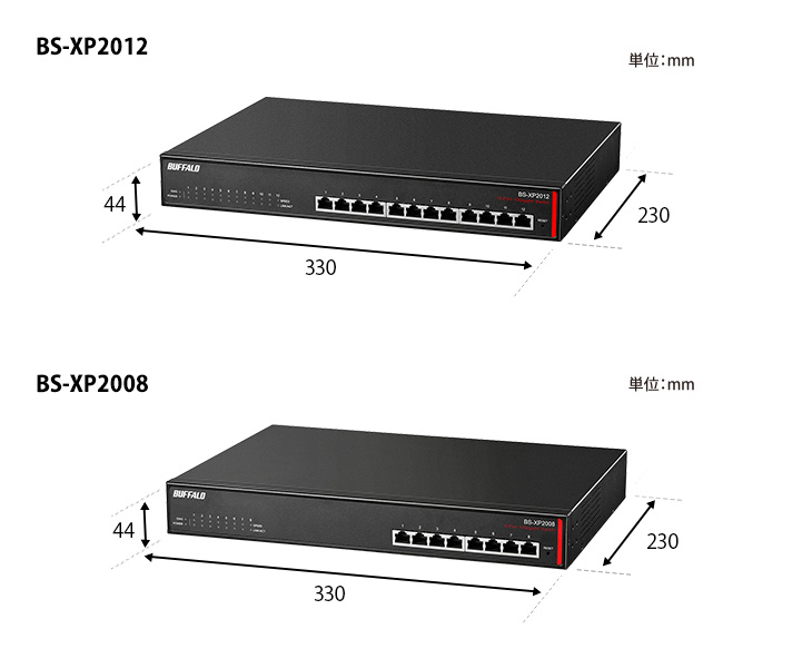 | ポート数 | BS-XP2012:100/1000M/10G 12ポート(全ポートAuto-MDIX機能搭載) BS-XP2008:100/1000M/10G 8ポート(全ポートAuto-MDIX機能搭載) |