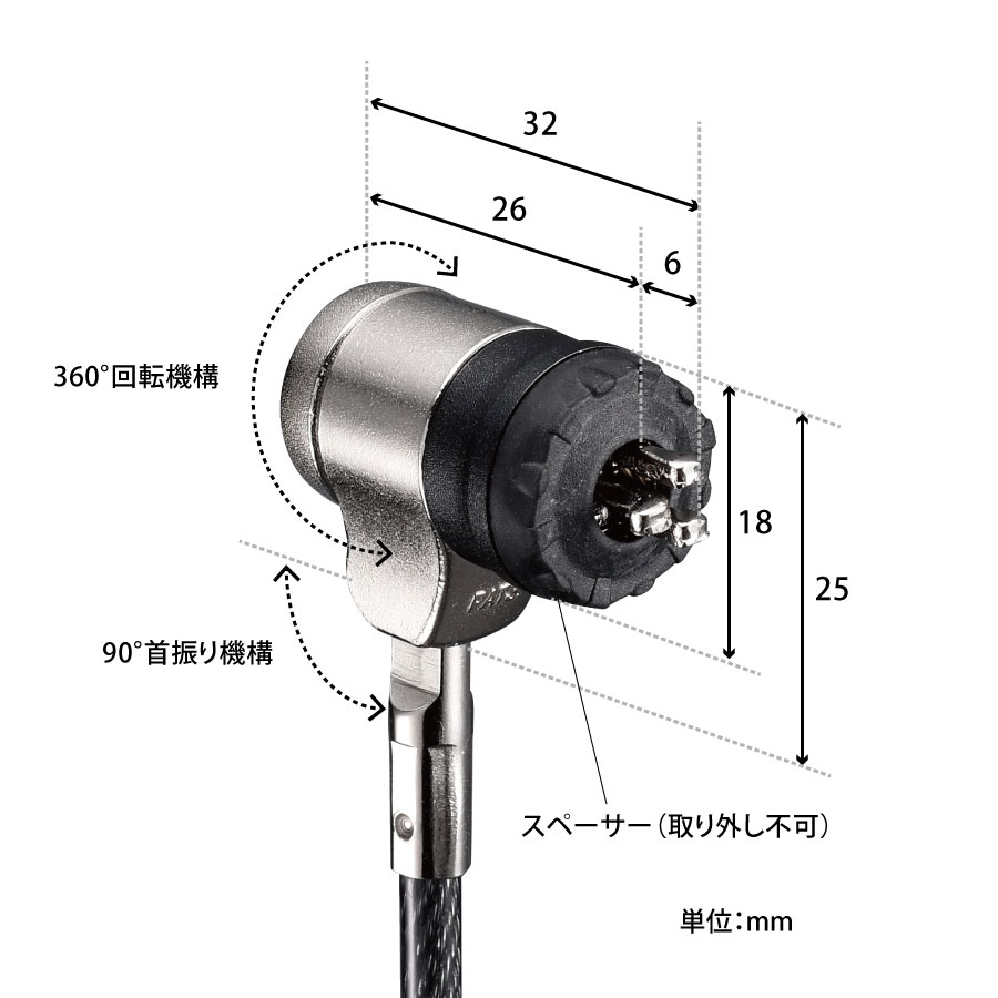 | 外形寸法 | ロック部 長さ 約32mm×径 約18mm(ワイヤーは除く※1)フック奥行 約6mm ワイヤー 長さ 約2000mm×径 約4.4mm ※1 ワイヤー接続部を含めると径18mm+7mm |