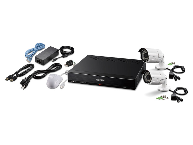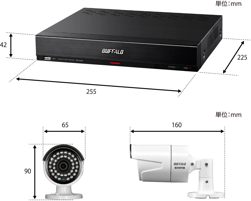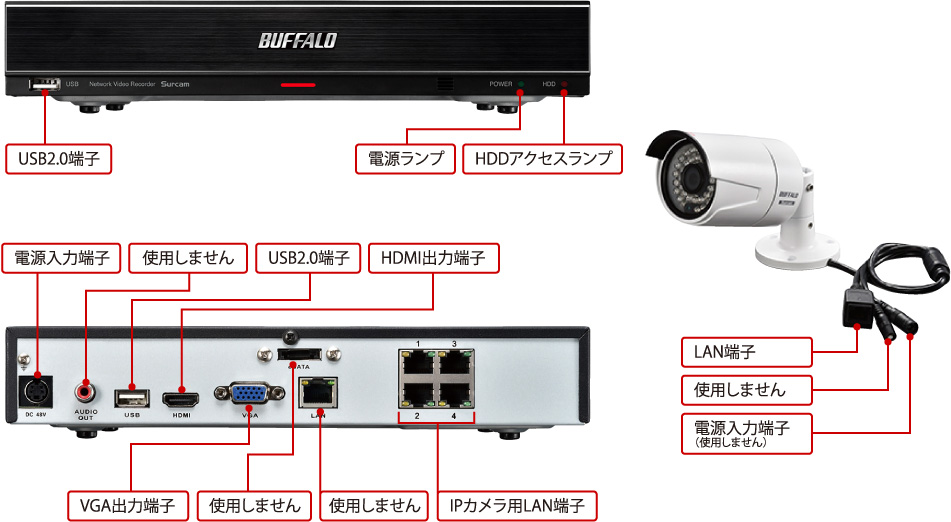| 付属品 | カメラ動作確認用LANケーブル 1.5m(1本)、HDMIケーブル 1m(1本)、ACアダプター、ACケーブル2極-3極変換、USB有線マウス、セットアップガイド、保証書、監視カメラ作動中シール(200×60mm)、IPカメラ1台につき:取付ネジ(+)Aなべタッピング ステンレス M3.5×30(3本)、アンカー(3本)、六角レンチ、LAN端子カバー | |