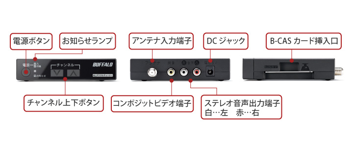 | 主な付属品 | リモコン コンポジットビデオ、アナログオーディオケーブル (1.5m) ACアダプター(1.8m) 電池(単4×2本、動作確認用) 本体固定用テープ B-CASカード マニュアル ※保証書はパッケージに記載 |