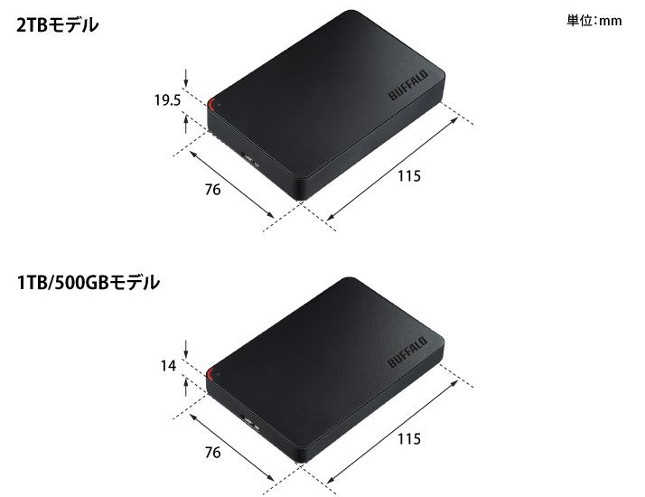 | 外形寸法(幅×高さ×奥行) | 2TB:76×19.5×115mm 1TB/500GB:76×14×115mm ※本体のみ(突起物除く) |