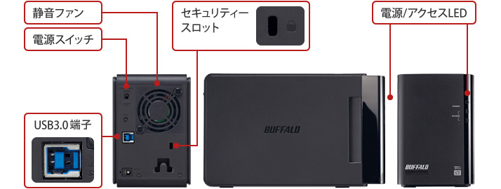 | 主な付属品 | USB3.0ケーブル(A to B 1m)、ACアダプター、ユーティリティーCD、取扱説明書、保証書 | |