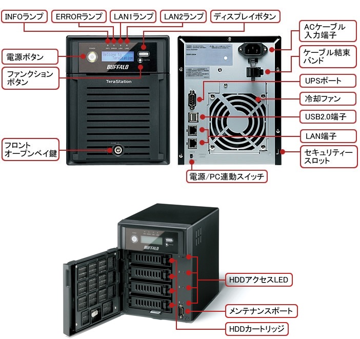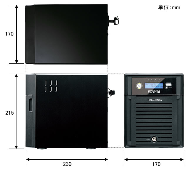 | 製品構成 | 本体 LANケーブル(ストレート、2m) ACケーブル(1.6m) 3極-2極変換アダプター フロントパネル開閉用鍵(2個) ユーティリティーCD(Tera Navigator(テラナビゲーター)、NAS Navigator(NASナビゲーター)2、簡単バックアップ、設定保存復元ツール、ファイル共有セキュリティレベル変更ツール、設定ガイド、Adobe Reader) 保証書 |