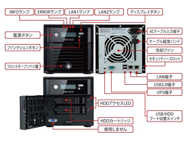 | 主な付属品 | 爪の折れないLANケーブル(2m) 、ACケーブル(1.6m)、3極-2極変換アダプター、フロントパネル開閉用鍵、ユーティリティーCD(テラナビゲーター、NASナビゲーター2、 ターボPC EX、NovaBACKUP、取扱説明書、Adobe Reader)、取扱説明書、保証書 | |