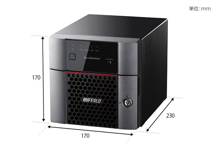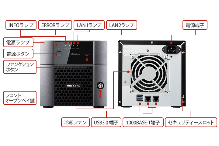 | 主な付属品 | LANケーブル(カテゴリー5e、ストレート、2m)、電源ケーブル(1.6m、コンセント側 NEMA 5-15P、電源ユニット側 IEC 60320 C13)、3極-2極変換アダプター、フロントパネル開閉用鍵(2個)、ケーブル抜け防止バンド、取扱説明書、保証書、型番シール(3枚) | |