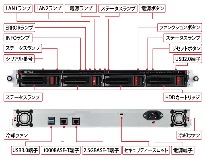 | 主な付属品 | LANケーブル(カテゴリー5e、フラット、2m) 、電源ケーブル、3極-2極変換アダプター、ラック取付金具一式、取扱説明書、保証書、型番シール | |