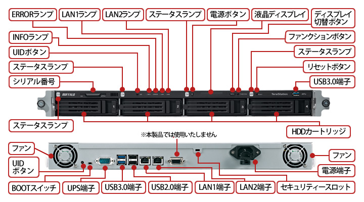 | 主な付属品 | LANケーブル(カテゴリー5e、ストレート、2m) 、ACケーブル、3ピン-2ピン変換アダプター、 ラック取付金具一式、ユーティリティーCD(テラナビゲーター、NASナビゲーター2、 ターボPC EX、ターボコピー、NovaBACKUP、設定ガイド、Adobe Reader)、取扱説明書、保証書 | |