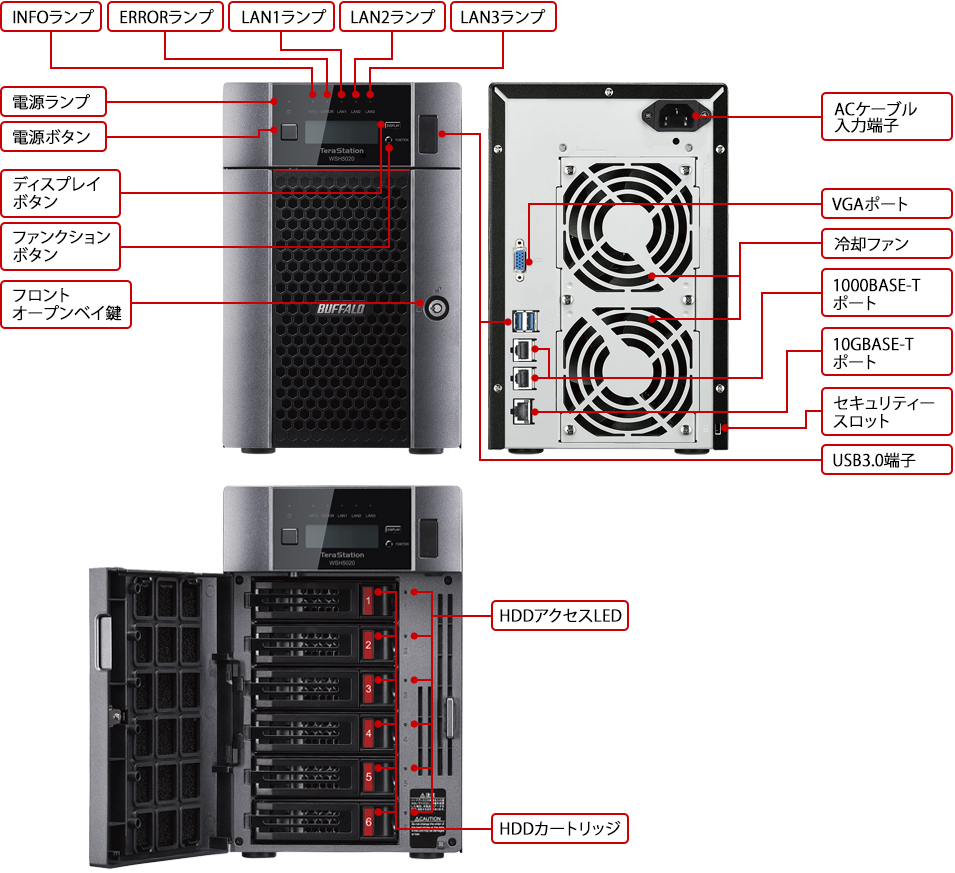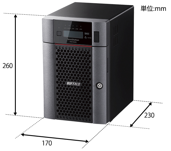 | 主な付属品 | LANケーブル(カテゴリー6A、ストレート、2m) 、電源ケーブル(1.6m、コンセント側 NEMA 5-15P、電源ユニット側 IEC 60320 C13)、3極-2極変換アダプター、前面カバー開閉用鍵、ケーブル抜け防止バンド、取扱説明書、保証書、型番シール | |