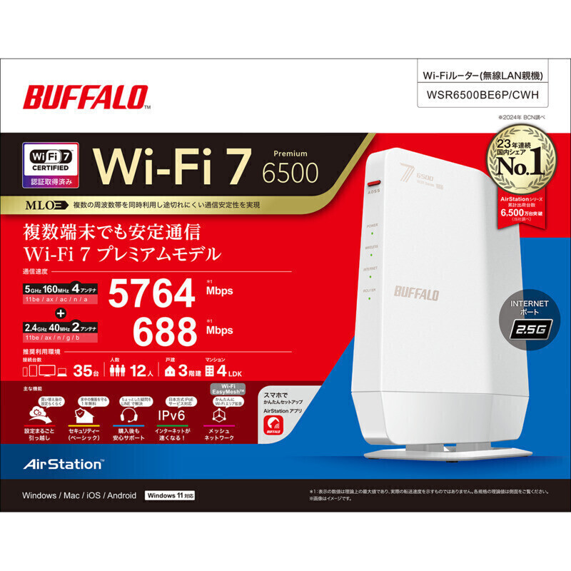 Wi-Fi 7(11be)対応デュアルバンドWi-Fiルーター 5764+688Mbps AirStation