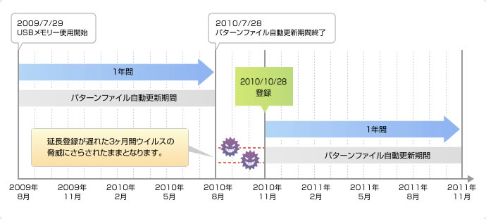自動更新期限が切れてからの延長登録も可能ですが、登録するまでは、パターンファイルが更新されません。その期間、最新のウイルスから無防備になりますので、延長登録可能日から90日以内の登録をおすすめします。