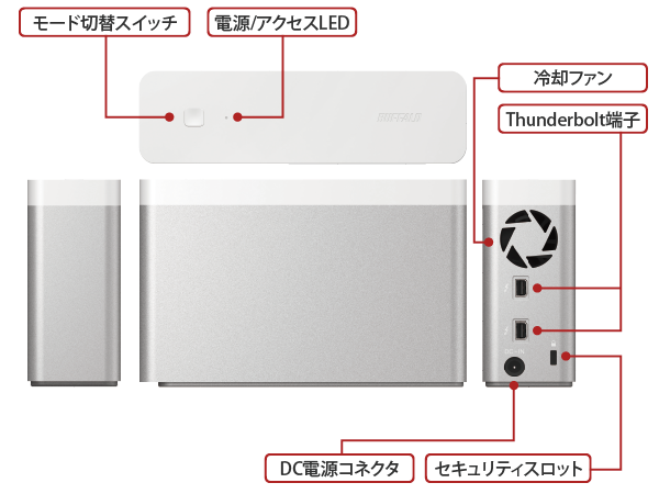 | 主な付属品 | Thunderboltケーブル(100cm)、ACアダプター、取扱説明書 ※保証書はパッケージ内ブタに記載 |