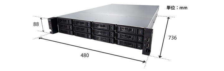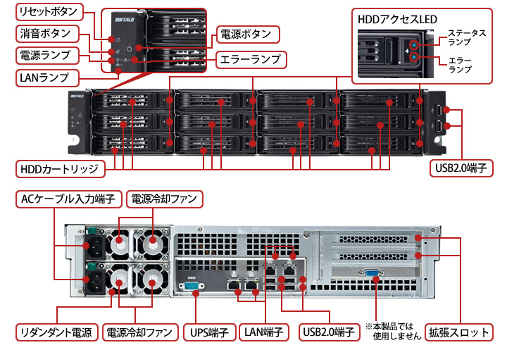| 主な付属品 | LANケーブル(カテゴリー5e、ストレート、3m) 、電源ケーブル(1.8m、コンセント側 NEMA 5-15P、電源ユニット側 IEC 60320 C13)×2、ユーティリティーCD(Tera Navigator(テラナビゲーター)、NAS Navigator(NASナビゲーター)2、NovaBACKUP、ターボPC EX、Adobe Reader)、ラック取付金具一式、取扱説明書、保証書 ※付属の電源ケーブルは本製品専用です。必ず付属の電源ケーブルを使用してください。また、他の製品に使用しないでください。 |