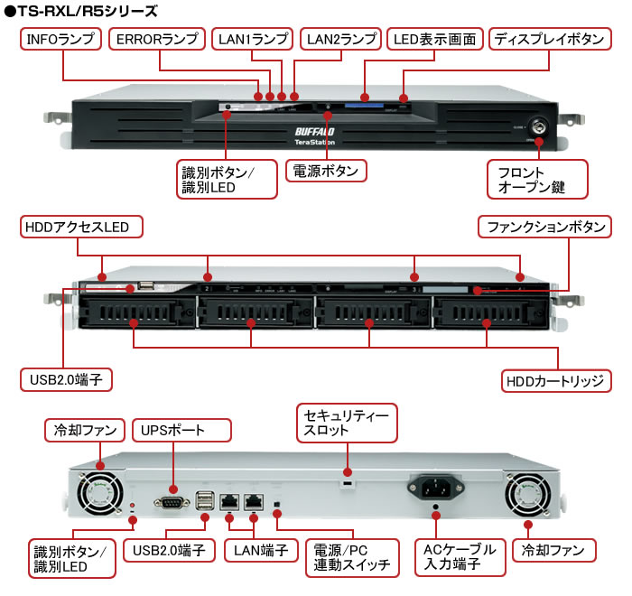 | 製品構成 | 本体 LANケーブル(ストレート、2m) ACケーブル(1.6m) 3極-2極変換アダプター フロントパネル開閉用鍵(2個) ラック取付用金具一式 ユーティリティーCD(Tera Navigator(テラナビゲーター)、NAS Navigator(NASナビゲーター)2、簡単バックアップ、EXT3リーダー、設定保存復元ツール、ファイル共有セキュリティレベル変更ツール、設定ガイド、Adobe Reader) 保証書 |
