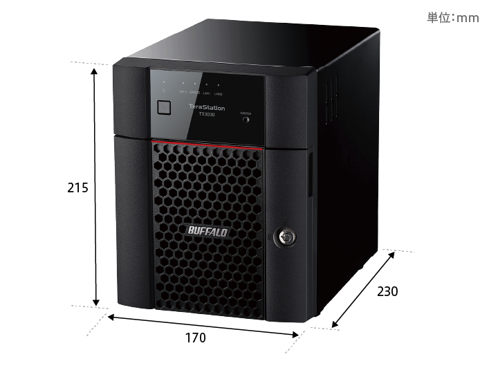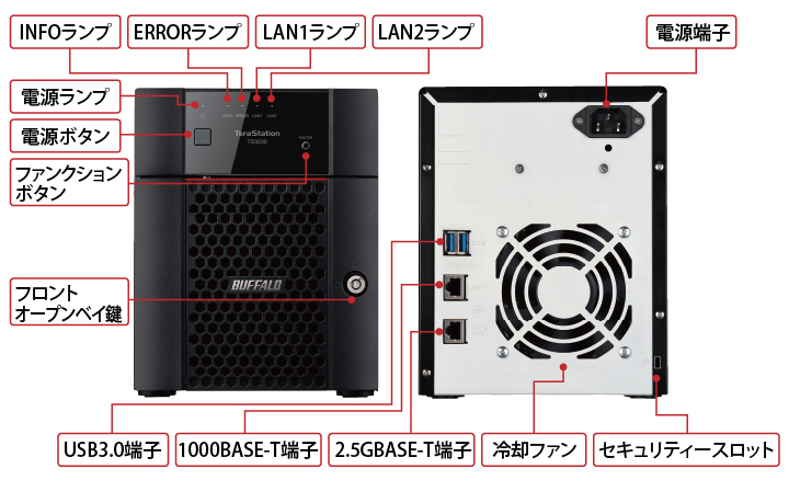 | 主な付属品 | LANケーブル(カテゴリー5e、フラット、2m) 、電源ケーブル、3極-2極変換アダプター、フロントパネル開閉用鍵(2個)、取扱説明書、保証書、型番シール | |