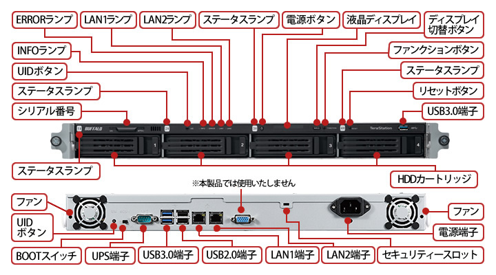 | 主な付属品 | LANケーブル(カテゴリー5e、ストレート、2m) 、ACケーブル、3ピン-2ピン変換アダプター、 ラック取付金具一式、ユーティリティーCD(テラナビゲーター、NASナビゲーター2、 ターボPC EX、NovaBACKUP、設定ガイド、Adobe Reader)、取扱説明書、保証書 | |