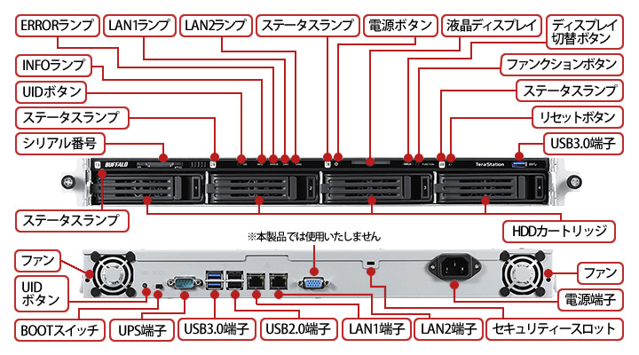 | 主な付属品 | LANケーブル(カテゴリー5e、ストレート、2m) 、ACケーブル、3ピン-2ピン変換アダプター、 ラック取付金具一式、ユーティリティーCD(テラナビゲーター、NASナビゲーター2、NovaBACKUP、設定ガイド、Adobe Reader)、取扱説明書、保証書 | |
