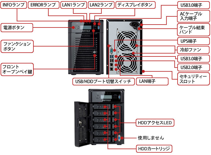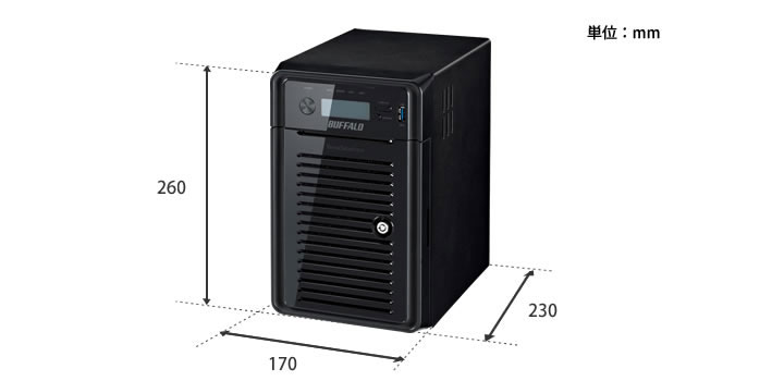 | 主な付属品 | LANケーブル(ストレート、2m) 、ACケーブル(1.6m)、3極-2極変換アダプター、ケーブル抜け防止、フロントパネル開閉用鍵(2個)、ユーティリティーCD(Tera Navigator(テラナビゲーター)、NAS Navigator(NASナビゲーター)2、NovaBACKUP、設定ガイド、Adobe Reader)、導入マニュアル、ハードディスク交換手順、保証書 | |