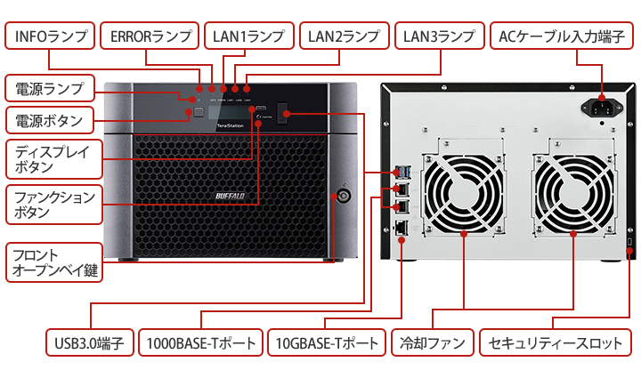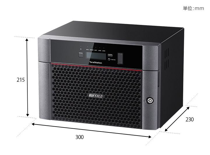 | 主な付属品 | LANケーブル(カテゴリー6A) 、電源ケーブル(コンセント側 NEMA 5-15P、電源ユニット側 IEC 60320 C13)、3極-2極変換アダプター、前面カバー開閉用鍵、ケーブル抜け防止バンド、取扱説明書、保証書、型番シール | |