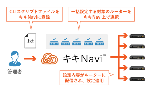 CLI(コマンドラインインターフェース)コマンドをテキスト形式(*.txt)で保存したファイルを「キキNavi」に登録することで、定義した設定を選択したルーターに一括設定できます。