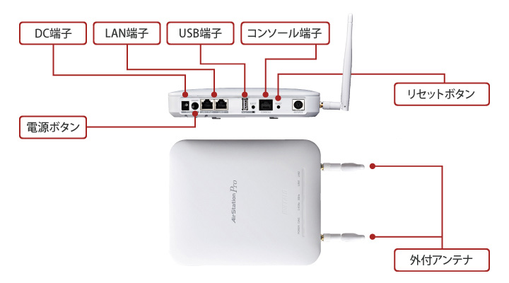 | サポート機能 | 電波出力調整、電波混雑防止機能、APSD、DTIM、Beacon Period、QoS、ロードバランス(接続台数制限)、無線LAN環境モニター、MAC-RADIUS認証、内蔵RADIUSサーバー機能、Proxy ARP(プロキシ・アープ)機能 | |
