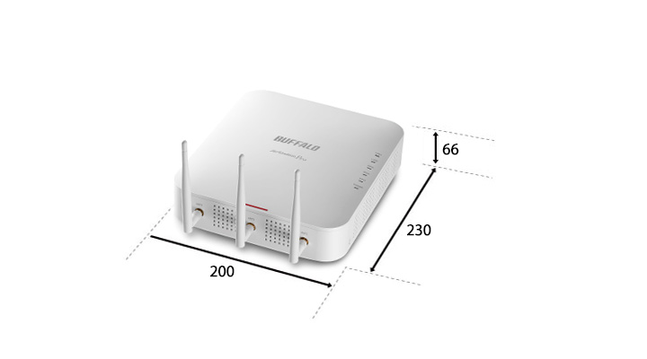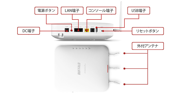 | サポート機能 | 公平通信制御機能、干渉波自動回避機能、電波環境見える化機能、電波出力調整、電波混雑防止機能、APSD、DTIM、Beacon Period、QoS、ロードバランス(接続台数制限)、MAC-RADIUS認証、内蔵RADIUSサーバー機能、Proxy ARP(プロキシ・アープ)機能 | |