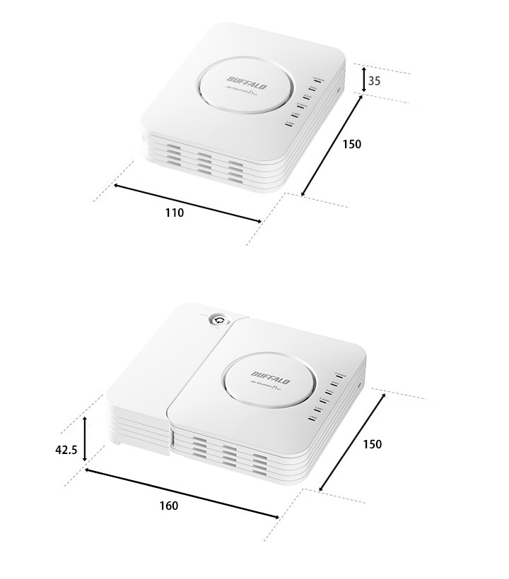 当社法人様向けアクセスポイントとしては最も小型※のW150×H110×D35mmサイズの筐体を実現(本体のみ)。 これまでのアクセスポイントのサイズ感を覆し、文庫本に匹敵する小型化を実現したことで、ホテルや店舗の小さなスペースに設置できることはもちろん、すっきりと目立たずに設置することができます。