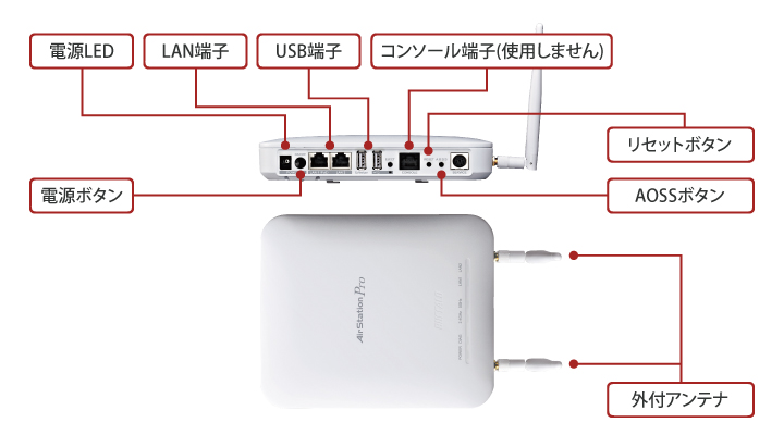 | 主な付属品 | 壁掛け金具、壁取付用ねじ、エアナビゲーターCD(エアナビゲーター、クライアントマネージャーV、クライアントマネージャー3、AirStation Admin To)、アンテナ×2本、マニュアル ※保証書はマニュアルに記載 |