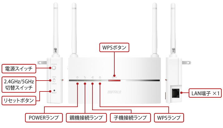 まずは本商品のWPSボタンを約2秒間プッシュ、次に現在お使いのWi-Fiルーター(無線LAN親機)のWPSボタンをプッシュして設定完了。 Wi-Fiルーター(無線LAN親機)の設定を引き継ぐので、今まで使っていたスマホやタブレット、パソコンといったWi-Fi対応機器の設定を変更する必要はありません。 従来他社製のWi-Fiルーター(無線LAN親機)をお使いの場合も、WPS対応であれば本商品をお使いいただけます。
