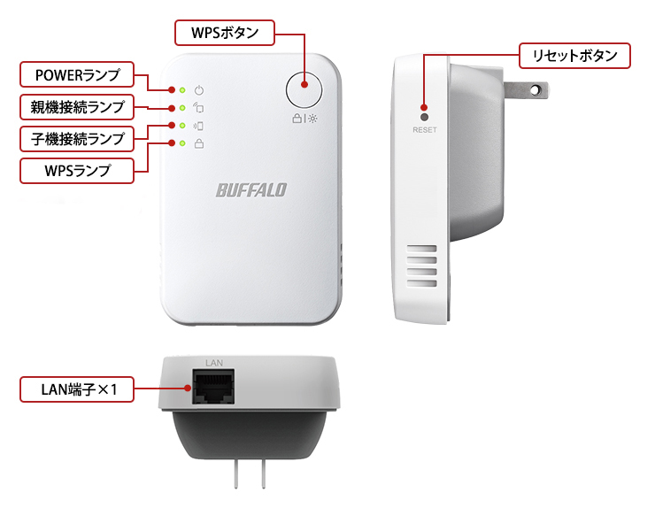 まずは本商品のWPSボタンを約2秒間プッシュ、次に現在お使いのWi-Fiルーター(無線LAN親機)のWPSボタンをプッシュして設定完了。 Wi-Fiルーター(無線LAN親機)の設定を引き継ぐので、今まで使っていたスマホやタブレット、パソコンといったWi-Fi対応機器の設定を変更する必要はありません。 他社製のWi-Fiルーター(無線LAN親機)をお使いの場合も、WPS対応であれば本商品をお使いいただけます。