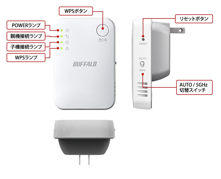 まずは本商品のWPSボタンを約2秒間プッシュ、次に現在お使いのWi-Fiルーター(無線LAN親機)のWPSボタンをプッシュして設定完了。 Wi-Fiルーター(無線LAN親機)の設定を引き継ぐので、今まで使っていたスマホやタブレット、パソコンといったWi-Fi対応機器の設定を変更する必要はありません。 他社製のWi-Fiルーター(無線LAN親機)をお使いの場合も、WPS対応であれば本商品をお使いいただけます。