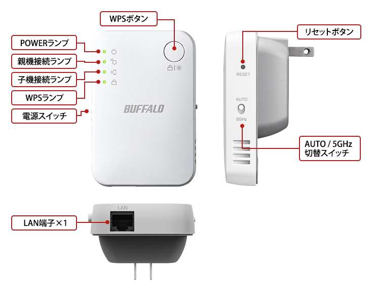 まずは本商品のWPSボタンを約2秒間プッシュ、次に現在お使いのWi-Fiルーター(無線LAN親機)のWPSボタンをプッシュして設定完了。 Wi-Fiルーター(無線LAN親機)の設定を引き継ぐので、今まで使っていたスマホやタブレット、パソコンといったWi-Fi対応機器の設定を変更する必要はありません。 他社製のWi-Fiルーター(無線LAN親機)をお使いの場合も、WPS対応であれば本商品をお使いいただけます。