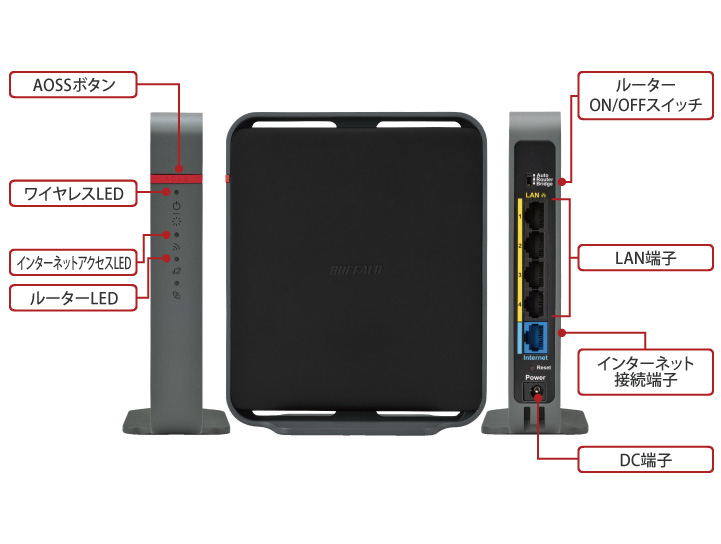 | 主な付属品 | LANケーブル(ストレート、0.5m) 、ACアダプター、エアナビゲーター2 CD(“エアナビゲーター2”、“クライアントマネージャーV”、“クライアントマネージャー3”、“AOSSアシスタント”、 エアステーション設定ツール)、取扱説明書、保証書(箱に記載) | |
