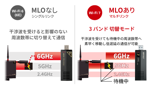 MLOを利用することで、2.4GHz/5GHz/6GHzのうち、複数の周波数帯に接続しながら、最適な周波数帯を瞬時に切り替えて利用できるようになりました。