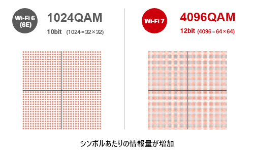 変調方式の改善により、通信効率が向上します。一度に表現できる情報量が、1024QAM(10bit)→ 4096QAM(12bit)に増加し、これにより通信速度が1.2倍に増加します。近距離通信時に有効な機能です。