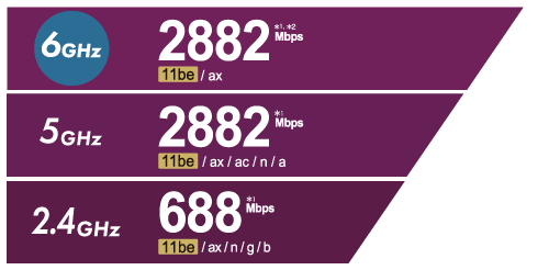 | 準拠規格(最大転送速度※理論値) | IEEE802.11be | 最大2882Mbps (6GHz帯) 最大2882Mbps※ (5GHz帯) 最大688Mbps※ (2.4GHz帯) ※セキュリティーでTKIP、WEP(128/64bit)使用時は、最大54Mbps(規格値)で動作します。 |