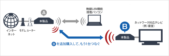 インターネットにつなぎたいパソコンが増えたときは、追加でワイヤレスユニットを購入いただき、接続台数を増やすこともできます。追加購入したワイヤレスユニットは、 ワンタッチ設定「AOSS」ボタンを押すだけで他のワイヤレスユニットにつながり、インターネットが利用できるようになります。